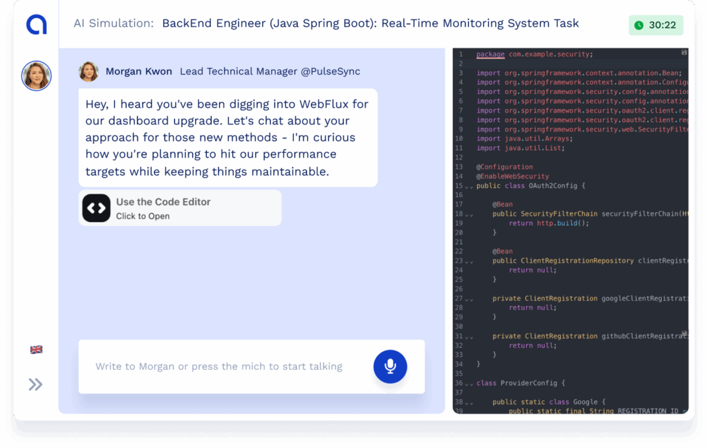 Engineers are placed in scenarios where they’re not just writing code, but working with AI stakeholders—product managers, tech leads, QA testers—who interact with them dynamically. The result is not only a test of skill but a powerful training environment that reflects the pressures and decisions of real engineering work.