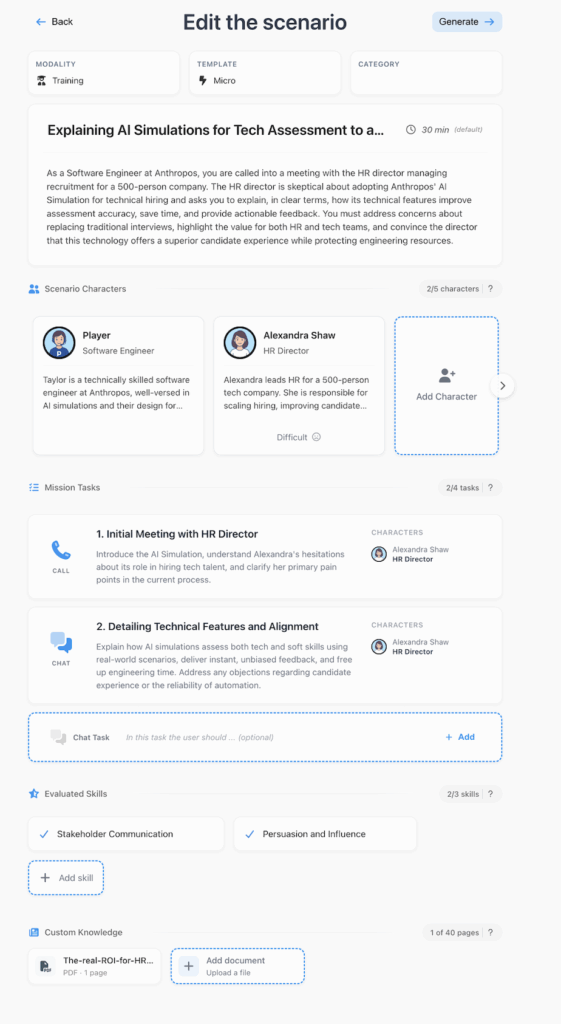 See an example below on how to build a custom AI Simulations to train your software engineers on sales and soft skills: I am creating an AI Simulations that helps software engineers in our team to present AI Simulations to potential HR leaders and they ask questions – technical and non technical. This is incredibly powerful to get them close to your business needs and do that from the day they start onboarding in your organization.
