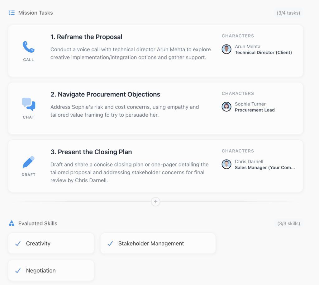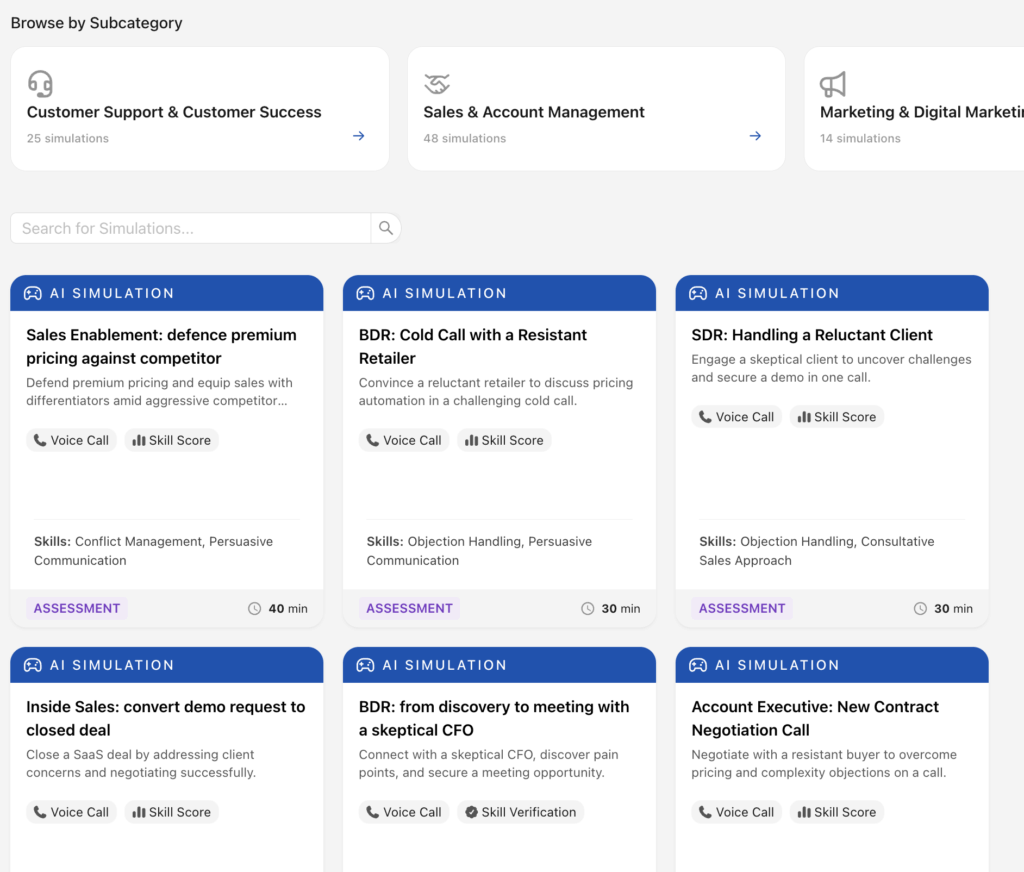 Sales and business roles require an incredible mix of skills that are difficult and expensive to test with live interviews. AI Simulations for Sales and Business roles help you assess candidates at scale.