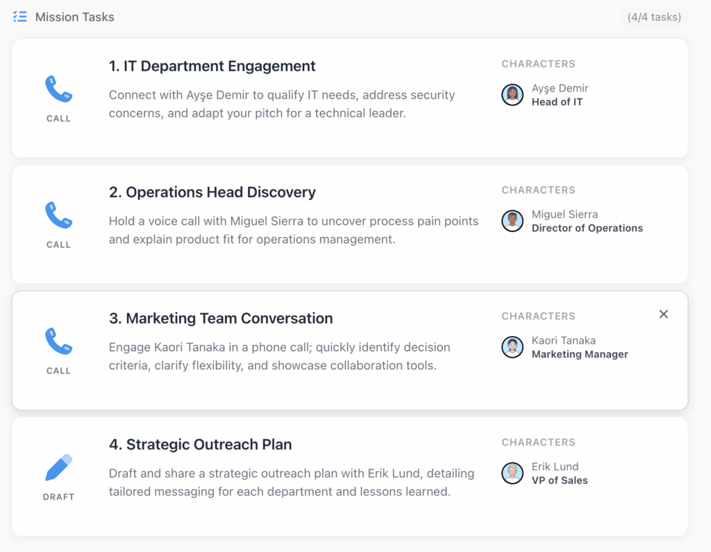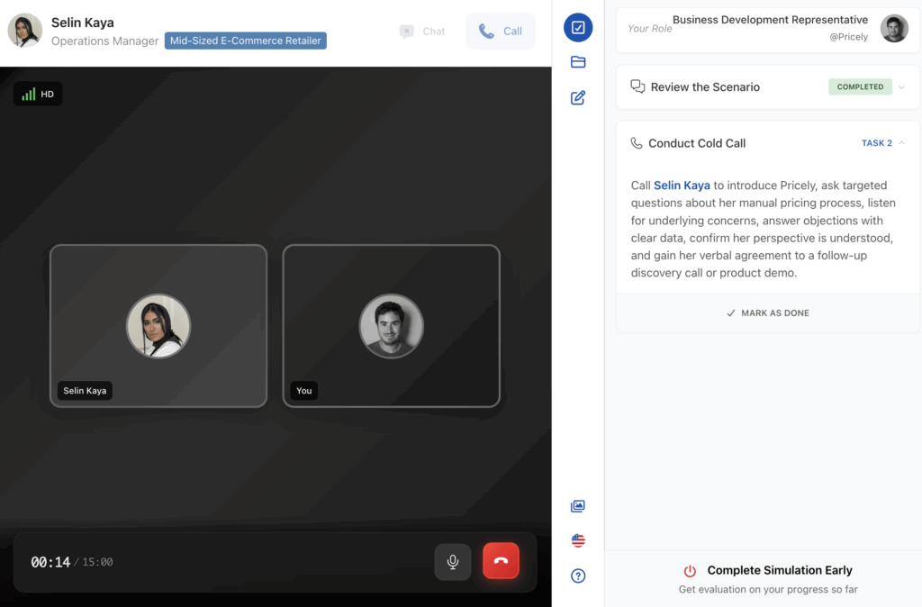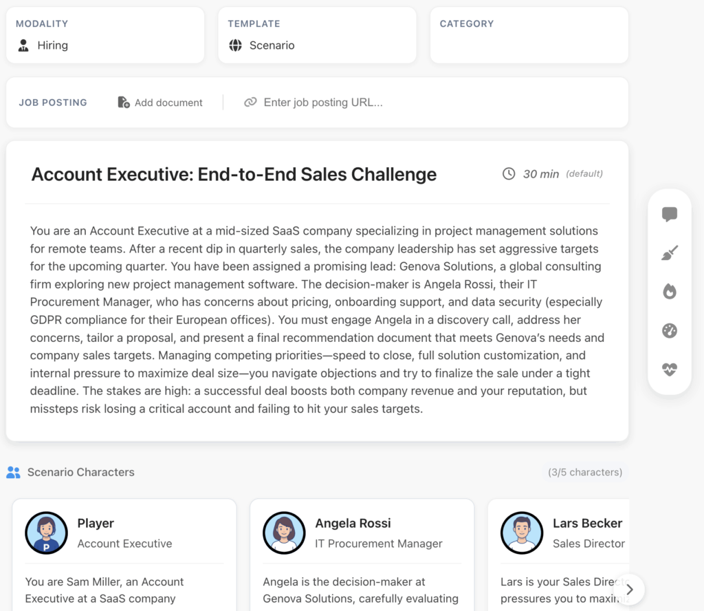 Test your candidates in real situations. Cold calls, customer escalations, critical deals and more.