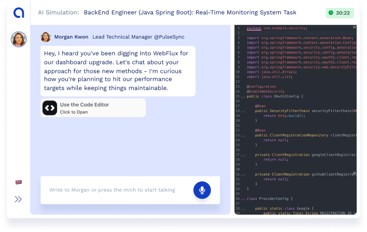 AI Simulations are real-life scenarios that reveal what interviews can’t — whether you are hiring Software Engineers or Sales Managers.